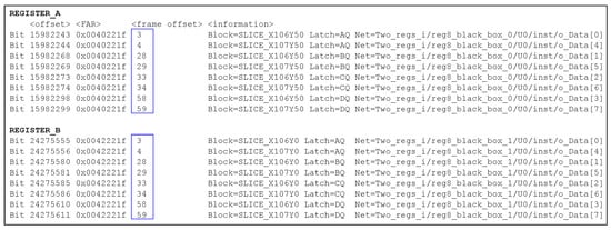 The CAPTUREE2 primitive [23] is a key tool from Xilinx for 7 series devices, which offers the possibility of capturing the state of user registers and storing it in the configuration memory by loading the GCAPTURE command. An alternative to the utilization of the CAPTUREE2 primitive is to load the GCAPTURE command in the CMD (command) register of the bitstream. Thanks to this, current register (flip-flop and latch) values can be stored in the configuration memory by triggering the CAP input from this primitive. These register values are stored in the same configuration memory cell that programs the init state configuration of registers (INIT values). These register values can be read from the device along with all other configuration memory contents by using the readback function. To take advantage of the CAPTUREE2 primitive, it is necessary to previously know the location of each data bit in the bitstream. The most straightforward way to obtain this information is to use Xilinx’s software (Vivado, ISE, etc.) to generate the logic location text file (*.ll).