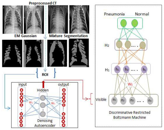 This work proposes a hybrid model for the identification of pneumonia that combines DAE and DRBM to allow for a more powerful classification model. In order to overcome the dimensionality problem during the training phase of the AE convolution, the ROI is extracted from the input scans using the discussed EMGM model in Section 3.1.