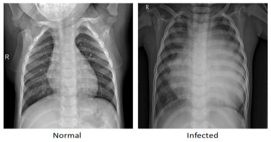 The proposed model is applied to a publicly available dataset of medical chest X-rays for pneumonia detection [34]. The digital computed radiography (CR) captured a total of 5856 images with 1583 normal cases and 4273 pneumonia cases. Figure 4 shows an example each of the CR scan for normal patients and for those diagnosed with pneumonia, in which the lungs in the normal scan are clear, while the lungs diagnosed with pneumonia look cloudy with a white area.