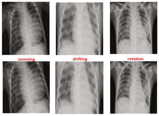As seen in Figure 5, zooming, flipping, shifting and rotation operations were used in the augmentation process to balance the distribution of the scans between Normal and Pneumonia cases. After applying the augmentation process to the Normal class, the number of normal cases increased from 1583 cases to 7915 cases. By contrast, the augmentation process for the Pneumonia class was performed on 75% of the 4273 using only one operation from the augmentation operations that was selected randomly. This results in an increase of the Pneumonia cases reaching a new total of 7478. This led to the reduction in the IR of Normal and Pneumonia cases from 46% to 2.8%, which is considered a huge improvement.