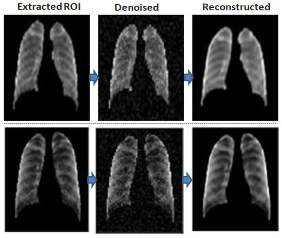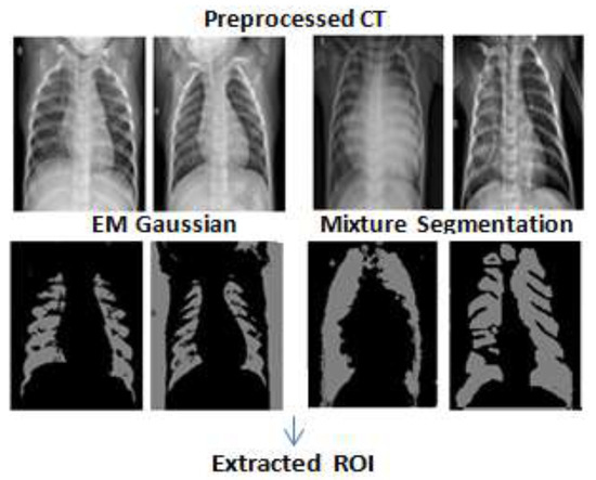 This section presents the entailed results from each phase of the proposed model as explained previously. The results from the segmentation phase using EMGMM to extract the ROI are shown in Figure 6, where the extracted ROI images are cropped and are fed to the training phase of the convolution denoising autoencoder (DAE) as shown in Figure 7.