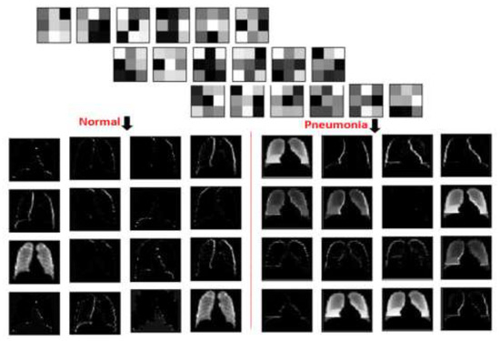 The applied 3 × 3 filter and the corresponding 32-item set of extracted features for normal and pneumonia samples, in left and right part of the figure, respectively.