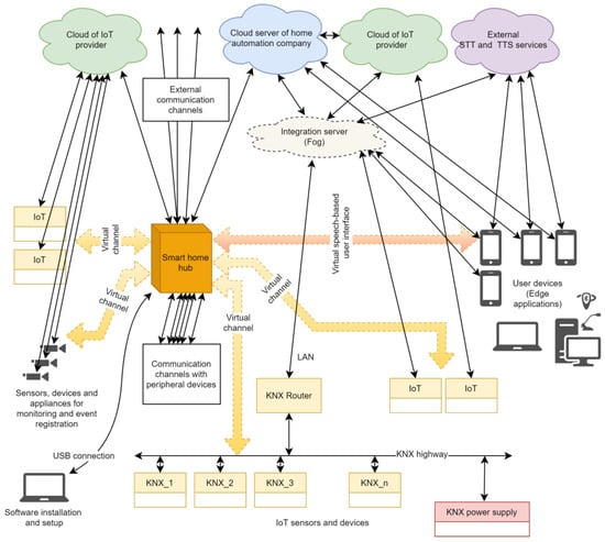 Figure 1 visualizes the communications of smart home components with system’s panel via two types of channels: (1) direct: to the peripheral devices and external computer networks and mobile networks; and (2) indirect: to IP sensors, devices and appliances, other control systems (KNX) and voice-based interface.