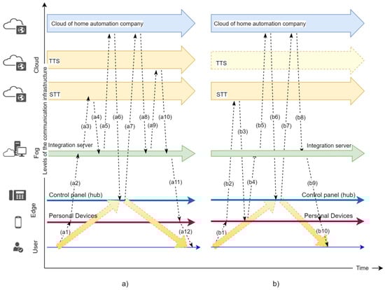 In this section, an intelligent home system, which employs the proposed IoTFC framework, has been presented. The new system can react immediately to all events that are signalled, i.e., the system operates normally in isolated (local) mode. This smart home system can collect and process data generated by its peripheral (edge) devices (sensors, devices and appliances) and control them remotely in real time. It can also communicate with user’s smartphones and wearable devices, but in these cases, Bluetooth communication protocol is required. The proposed architecture for smart home allows for integration with other external systems (for example, systems for building automation), acting as a hub connecting different systems. The smart system can transmit IoT data to the fog layer via REST HTTP protocol, which provides flexibility and interoperability in building RESTful services. This feature ensures backward compatibility with legacy systems running in the computational infrastructure of smart home automation company. Local computing entities (fog nodes) can filter received data and either process it locally or send it to the cloud for further processing. The voice user interface provides control and monitoring services using real-time data about devices’ state and events occurring in the home environment. It can be deployed in any layer of the smart home architecture. The voice user interface can be implemented in any non-tonal language, including under-resourced ones, if STT and TTS services are available for it.