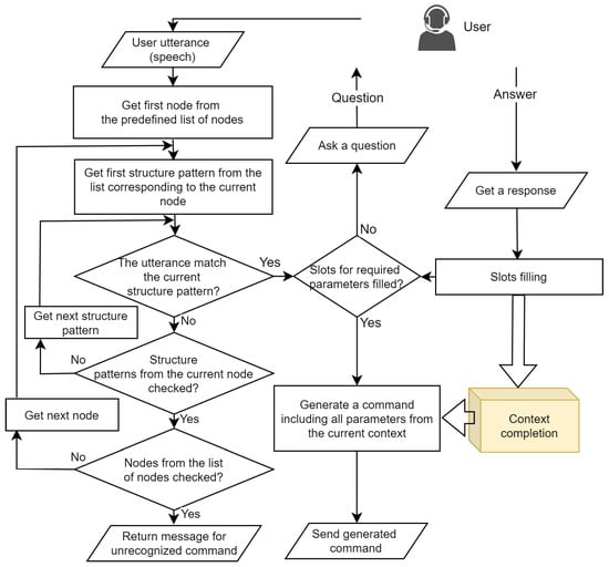 Figure 3 and corresponding steps in Algorithm 2 depict the proposed intent detection method (Algorithm 1, Step 5). In the algorithm description, a node represents a collection of predefined information structures, which is necessary to recognise each possible executable command. They are stored as a list of nodes. Each node contains a list of structural patterns, a list of slots, and command generation mechanism.