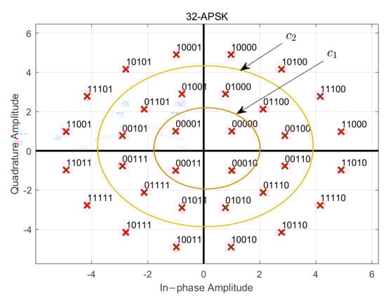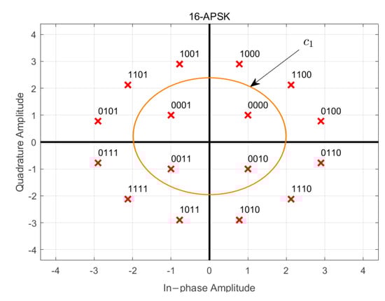 It can be seen that the weight of the detection statistic for each ring on the constellation is different. Thus, it is important to perform correct ring judgment for constellation symbols, i.e., to determine to which ring each symbol belongs. The ring judgment threshold is defined as , where is the ring judgment threshold between the th and th ring. Based on the signal amplitude, the radius of each ring on the constellation is calculated as