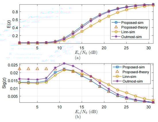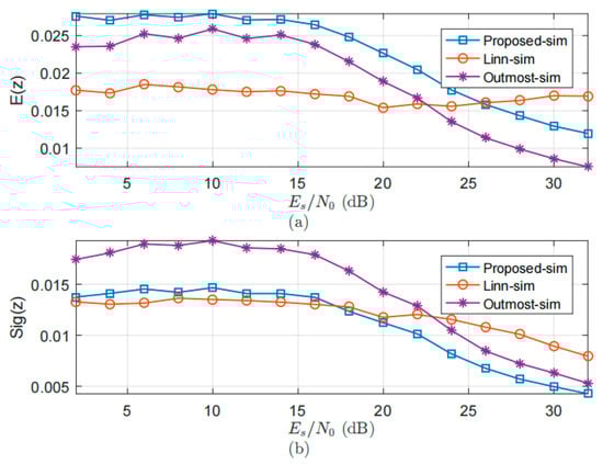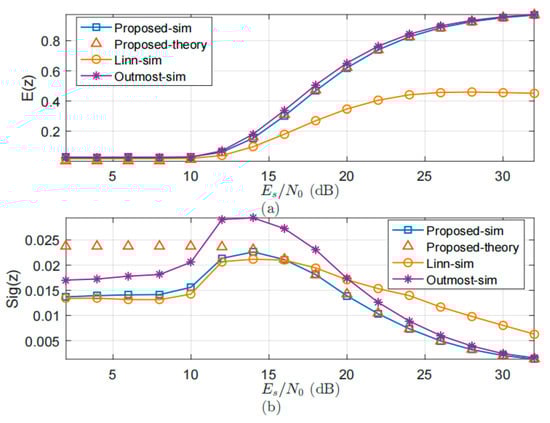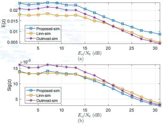 In the simulation results, let E(z) and Sig(z) denote the expectation and variance of the detection statistic of the lock detector, where ‘z’ denotes the detection statistic. Figure 4a,b show the simulation results of expectation and variance versus the SNR under the condition that carrier synchronization is locked for the 16APSK signal. It can be seen from Figure 4a that the theoretical value of expectation of the proposed detector is basically consistent with the simulation value. With an increase in the SNR, the expectation of all detectors shows an upward trend. The expectation of the proposed detector is similar to that of the outmost detector and is greater than that of the Linn detector. It can be seen from Figure 4b that the theoretical value of variance is only consistent with the simulation value when the SNR is greater than 10 dB, but separation occurs when the SNR is low. This is because there will be errors in ring judgment according to signal amplitude in the simulation at low SNRs, and the error of ring judgment is not considered in the theoretical analyses. When the SNR is lower than 10 dB, the variance of the proposed detector is larger than that of the Linn detector, but smaller than that of the outmost detector. When the SNR is larger than 15 dB, the variance of the proposed detector is smaller than those of the other two detectors.