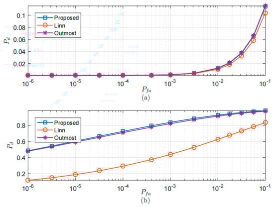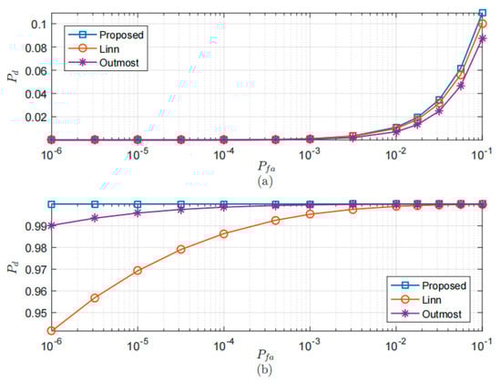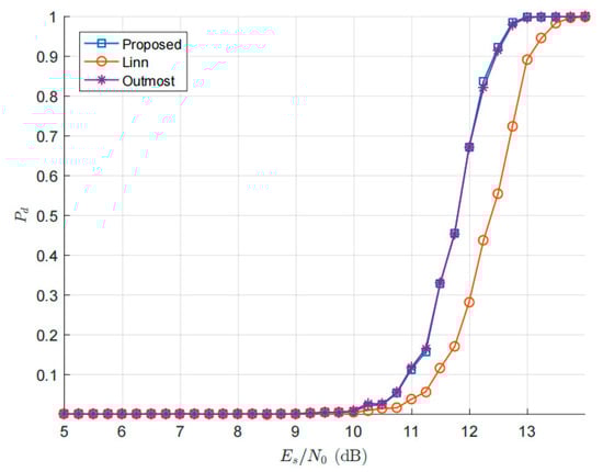 Figure 8 shows ROC curves of the 16APSK signal carrier synchronization lock detector at two different SNRs ( and ). It can be seen that the performance of the three detectors is similar at lower SNRs, and the proposed detector has the best performance over the other two detectors at higher SNRs. Figure 9 shows ROC curves of the 32APSK signal carrier synchronization lock detector at two different SNRs ( and ). It can be seen that the performance of the three detectors is similar at lower SNRs. However, when the SNR is higher, the performance of the proposed detector is similar to that of the outmost detector and higher than Linn detector.