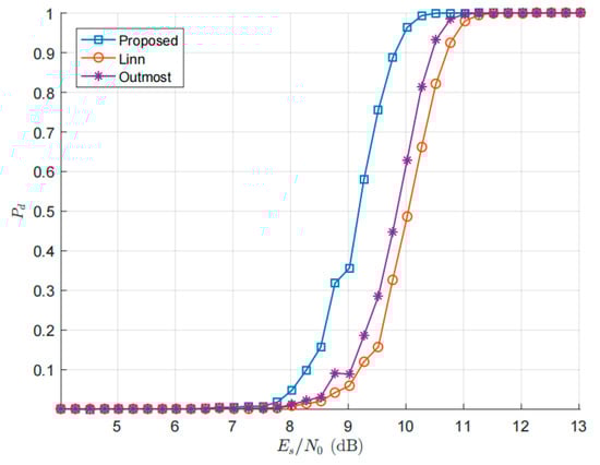 Figure 10 and Figure 11 show the lock detection probabilities of 16APSK and 32APSK signals, respectively. In the simulation, set . For the 16APSK signal, when and , the three detectors have similar performance. When , the proposed detector has the best performance compared with the other two detectors. For the 32APSK signal, when and , the three detectors have a similar performance. When , the proposed detector shows a similar performance to the outmost detector and a better performance than the Linn detector.