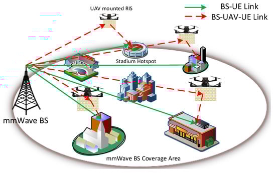 In dense hotspot scenarios containing numerous numbers of mmWave users, mmWave coverage should be extended and strengthened to fully cover hotspot users and overcome their mutual path blockage. In this regard, reconfigurable intelligent surface (RIS) [] can provide an effective solution. It is a talented 6G approach that can smartly reconfigure the wireless communication channel []. This means that an RIS board can effectively control the mmWave channel by reinforcing the received signal in some directions and weakening it in other directions []. Thus, it can provide additional non-line of sight (NLoS) paths to mmWave users inside their hotspots. This can be conducted by passively controlling the incident Electromagnetic wave (EM) on the RIS board by adjusting the phase shifts (PSs) of its antenna array []. By this way, the complicated RF chains in the conventional relaying systems are highly relaxed []. Due to its cheapness and ease of installation, researchers investigated the application of RIS in numerous wireless communications systems [,,,,]. These applications extend and strengthen the mmWave coverage, as presented in this paper [,]. However, in the case of numerous hotspots scenario, it will be challenging to install RIS boards nearby each hotspot, especially in the case of momentarily hotspots such as stadiums, theaters, markets, etc. In these scenarios, unmanned aerial vehicles (UAVs) will provide a practical and cost-effective solution, where the RIS boards will be attached to the UAVs. Then, these multi UAV mounted RIS will be distributed in the region of hotspots, and each UAV will serve a particular hotspot area. Recently, UAVs received significant attention in wireless communication due to their flying and maneuvering capabilities. For example, UAVs can be used as airborne base stations (BSs) to provide wireless connectivity in remote and post-disaster/stricken areas []. In addition, they can be used as relays to extend the coverage of mobile base stations (BSs) []. Moreover, data collection such as aerial photography, traffic, and environmental monitoring can be conducted quickly by UAVs [,].