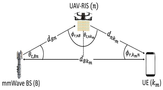 Schematic diagram of the mmWave BS, UAV mounted RIS, UE communication links.