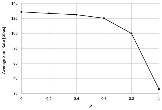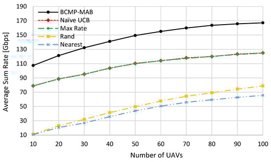 Figure 5 shows the average sum rate against the number of used UAV-mounted RIS. It clearly appears that the proposed BCMP-MAB has the best performance among the schemes involved in the comparison. This comes from compromising between maximizing the achievable data rate while minimizing UAVs energy consumption. Nevertheless, the proposed UAV scheduling mechanism orchestrated by mmWave BS eliminates collisions, i.e., reward sharing among UAVs, hence maximizing the average sum rate compared to other benchmarks. It is interesting to notice that the average sum rate performance of naïve UCB matches that of max rate. This is because UAV always selects the hotspot with the highest average data rate for both schemes. Moreover, both schemes show lower average sum rate performances than the proposed BCMP-MAB because there is no collision avoidance mechanism in these schemes. Thus, multiple UAVs can cover the same hotspot and share its achievable data rate among them, while many other hotspots are left uncovered. Rand and nearest show the worst performance, and Rand is slightly better than the nearest due to randomness in selecting the associated hotspot. At , the proposed BCMP-MAB shows a higher average sum rate than naïve UCB/max rate, Rand and nearest by 1.36, 9.52 and 10.19 times, respectively. However, at , these values become 1.35, 2.12, and 2.54 times, respectively.