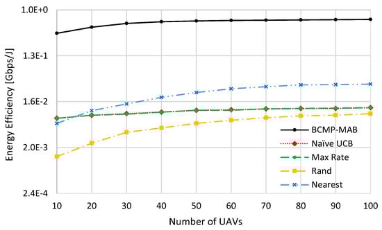 Figure 6 shows the energy efficiency performances in Gbps/J of the schemes involved in the comparisons. As shown by this figure, the proposed BCMP-MAB has the best energy efficiency due to compromising between maximizing the achievable data and minimizing the energy efficiency, and maintaining collision free among UAVs. In addition, Nearest shows better energy efficiency than naïve UCB, max rate, and Rand. This is because it highly reduces the flying energy consumption of UAVs due to selecting the nearest hotspot to them. Again, naïve UCB and max rate show almost the same energy efficiency performance due to their identical objective. At , about 47 and 265, and 59.3 times higher energy efficiency than naïve UCB/max rate, Rand and nearest are obtained by the proposed BCMP-MAB algorithm, respectively. These values become 54.6, 71.5, and 18.76 times at , respectively.