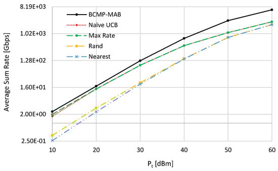 In this part of numerical analysis, we will bound the performance of the schemes involved in the comparisons against the TX power dBm. Figure 7 shows the average sum rate performances of the schemes involved in the comparisons against dBm using . From this figure, the proposed BCMP-MAB has the best performance, especially for high values due to its spectral efficiency maximization combined with UAVs collision avoidance. Still, naïve UCB and max rate schemes show almost the same performance, and rand-based selection outperforms the nearest based on their policies. At dBm, the proposed BCMP-MAB algorithm obtains average sum rate higher than naïve UCB/max rate, Rand, and nearest by 1.44, 6.35, and 9.4 times, respectively. However, at dBm, about 2.52, 3.13, and 3.14 times higher average sum rate than naïve UCB/max rate, Rand and nearest, are obtained, respectively.