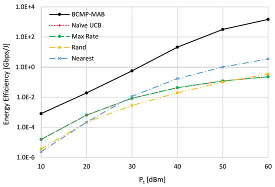Figure 8 gives the average energy efficiency of the schemes involved in the comparison against . As explicitly shown, the proposed BCMP-MAB has the best performance for all tested values. In addition, naïve UCB and max rate almost have the same performance due to the aforementioned reasons. Rand has the worst energy efficiency performance especially for high values of . It is interesting to notice that the nearest hotspot-based selection has lower energy efficiency performance than naïve UCB, max rate, and even Rand at low values, while it shows better performance than those at high values. This is because at very low values, the hovering time will be considerable. This makes the hovering energy consumption larger than the flying energy consumption and has the most dominant effect. Thus, all compared schemes, without energy minimization features, will influence almost the same energy consumption values. Hence, the average sum rate of these schemes will have the dominant effect in differentiating among their energy efficiency performances. However, at high values of the opposite happens, i.e., the flying energy consumption will be higher than the hovering energy consumption. Consequently, the nearest scheme will have lower energy consumption than naïve UCB, max rate, and Rand, which results in improving its energy efficiency over them, as shown in Figure 8. At dBm, the energy efficiency of the proposed BCMP-MAB is 52.36, 221.76, and 342.72 times higher than naïve UCB/max rate, Rand, and nearest, respectively. At dBm, these values become 6419.5, 4291.8, and 425.2 times, respectively.