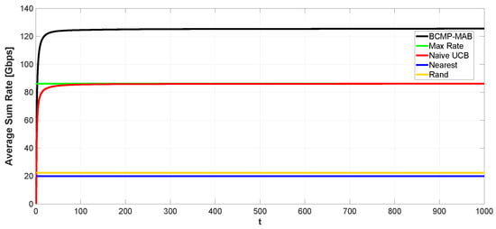 Figure 9 and Figure 10 show the convergence performances of the schemes involved in the comparisons against the time horizon. In the conducted simulations, is set to 1 Watt, , in Figure 9 while in Figure 10. From both figures, the proposed BCMP-MAB shows fast convergence comparable to the convergence rate of the naïve UCB. For both cases, at , the average sum rate of the proposed BCMP-MAB and naïve UCB reached about of their maximum values at . In addition, the average sum rate of the naïve UCB converges to that belongs to the max rate scheme.
