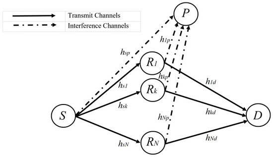 As depicted in Figure 1 below, a dual-hop cognitive relaying network is considered. The network consists of one PU, one SU and a few relays. In particular, the SU comprises a source node S, multiple AF relays () and a destination D. The interference from the PU receiver P is considered as well. Moreover, it is supposed that the path loss and severe shadowing prevents the existence of a direct link between S and D. The SU source S transmits the signal in the first hop into N relays under interference power constraint . After that, the received signal is amplified using the relay with a variable gain , and it is forwarded to the SU destination D, where can be expressed as follows
