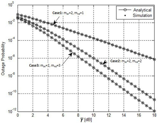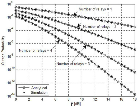 The outages for the considered spectrum-sharing network under different settings for the number of secondary relays are depicted in Figure 2. It is noteworthy that the diversity order increased by increasing the number of SU relays. The figure shows that the performance of the CRN improved as the number of the SU increased. On the other hand, increasing the number of SU relays would improve the performance but would consume more power and make the network more complex. Moreover, it is worth noting that the BRS scheme selected the best relay from several relays. Therefore, it was not necessarily the case that more improvement would be achieved when we changed the number of relays from two to three compared with the case when we changed the number of relays from one to two. Overall, the simulation results coincided with the derived analytical results and there was an improvement by using more relays within the SU.