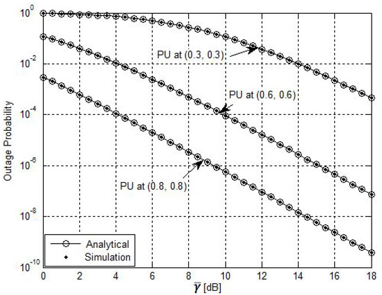 The impact of the PU location on the OP of the considered system model for several locations of the PU is shown in Figure 4. In particular, the outages for three distinct locations for the PU are provided. The figure shows that as the PU moved away from the SU network, better performance could be achieved, and the interference threshold of the PU could be tolerated. Hence, the best case among the various considered PU locations was achieved when the PU was at the (0.8, 0.8) coordinates. Moreover, the simulation results coincided with the derived analytical results for the various PU locations.