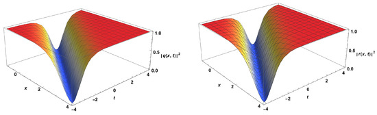 Surface plots of dark solitons (34) and (35) with , , , , , , , , , , , , and .