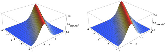Surface plots of bright solitons (51) and (52) with , , , , , , , , , , , , , and .