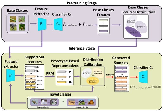 The generation-based methods [8,9,18,19,20,21] build complex networks for generating more additional samples or features. Bendre et al. [8] reconstruct features by employing a multimodal strategy including semantic and image information. Li et al. [9] introduce a conditional Wasserstein GAN (WGAN) to synthesize fake features. By contrast, Hong et al. [21] combine the matching procedure with GANs [22] to generate image samples instead of features. Yang et al. [10] propose a novel generation-based method called distribution calibration, which calibrates the biased feature distributions of few-shot classes to approximate the corresponding ground-truth distributions. Sufficient labeled features can be generated from the calibrated distribution for supervised training. Compared with this calibration strategy, our method can more accurately estimate the ground truth distributions and adapt to different application scenarios.