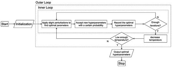 The basic block diagram of the Self-Adaptive Hyperparameter Optimization Algorithm, which contains two loops. In the inner loop, a slight perturbation is applied to the current hyperparameters, which are accepted with a certain probability. In the outer loop, the temperature decreases from a high value to a pre-set stop temperature.