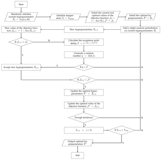In the inner loop, a slight perturbation is added to a random hyperparameter, resulting in a new error rate. We compare the new error rate with the current error rate. In the first case, the new hyperparameters are accepted if the new error rate is less than the current error rate. In the other case, if the new error rate is greater than or equal to the current error rate, the acceptance probability is determined by the current temperature and the difference between the new error rate and the current error rate as Equation (18), which helps jump out of the local minimum. Suppose new hyperparameters are accepted, and the new error rate is lower than the optimal error rate. In that case, the optimal error rate and the optimal hyperparameters are updated by the new error rate and new hyperparameter.