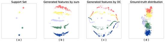 The t-SNE visualization of generated features and ground-truth distributions on a random 5-way-1-shot task sampled from miniImageNet. ★ in (a–d) represents support set features, ▲ in (b,c) represents the generated features, × in figure (d) represents features of ground-truth distributions.