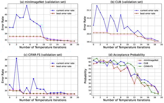 Visualization of the error rate and acceptance probability on validation sets of miniImageNet, CUB-200-2011, and CIFAR-FS. (a) The variation of the model error rate on the validation set of miniImageNet as the temperature iterations increase. (b) The variation of the model error rate on the validation set of CUB-200-2011 as the temperature iterations increase. (c) The variation of the model error rate on the validation set of CIFAR-FS as the temperature iterations increase. (d) The variation of acceptance probability on three datasets as the number of temperature iterations increases.