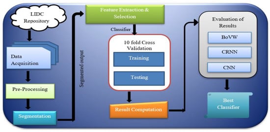 According to WHO (World Health Organization), 8.9 million deaths occur due to lung cancer worldwide, and in 2030 the number is estimated to reach 17 million []. The only option to reduce the fatality rate is early screening and diagnosis. The quintessential part needed is lung tissue segmentation for quantitative analysis of CT images and computer-aided diagnosis. As the development of new devices in this era is evolving, we need fast, accurate, and mostly automatic lung cancer diagnosis, which is much more important than impractical methods []. Computer-Assisted Diagnosis (CAD) is a computerised study of medical images currently in use. It is commonly used to identify and treat medical imaging anomalies. CAD has become significant in identifying pulmonary nodules using radiology CT images. The CAD software helps radiologists to have a second opinion in affirming their decision in distinguishing the abnormalities, the evaluation of disease improvement, and the differential conclusion of the disease []. Figure 1 shows the block diagram of the proposed cancer detection method.