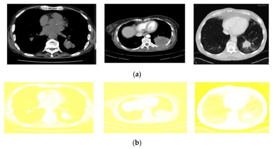 After Dennis Gabor, the name of Gabor filter came into existence; the filter can be used for texture analysis purposes. When the Gaussian and harmonic function is multiplied, we gain an impulsive response of that filter. It mainly analyses if there is any specific frequency in the specific direction of an image []. That filter is the most suitable solution for texture representation and discrimination of images in the spatial domain. The Figure 4a,b shows the CT lung images and the Gabor filter pre-processed images in this research work, respectively.