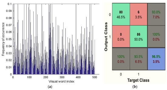 Bag of visual words (BoVW) is an extension of the NLP algorithm which follows the supervised learning model. The classifier aims to reduce time consumption by automatically selecting the features accompanying the classification process. It is a commonly used solution, apart from the widely-known CNN []. BoVW has been developed to obtain a comprehensive language which can better explain the image in terms of extrapolated features. BoVW employs the Computer Vision Toolbox TM functions to define image categories by constructing a bag of visual words. The proposed approach generates a histogram of the image by considering the frequency of visual words. After that, the histogram is utilised for training a classifier for image categories. The procedures below show the to set up process of the target images, generating a bag of visual words, and then training and application of an image classification classifier []. The BoVW is broken down into four simple steps: (1) analysis of the image qualities of a given label; (2) clustering used to create visual vocabulary, which is preceded by frequency analysis, (3) vocabulary classification of the produced samples, (4) determination of the most appropriate class for the image query. The algorithm for the bag of visual words classifiers is as follows: