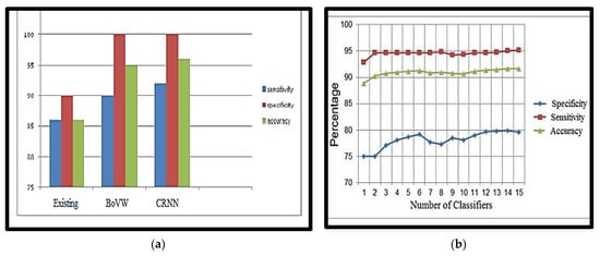 The obtained accuracy after optimisation was 98.5%. Table 6 analyses performance parameters for the BoVW and CRNN classifiers. The parameters considered here are accuracy, sensitivity, specificity, precision, PSNR and MSE values. For the BoVW classifier, accuracy was 96.5%, sensitivity was 93%, specificity was 100%, precision was 93.5%, PSNR value was 42.278, and the MSE was 3.474. For the CRNN classifier, accuracy was 98.5%, sensitivity was 95%, specificity was 100%, precision was 95.5%, PSNR was 69.154, and the MSE was 2.193. From Table 6, it is clear that CRNN provided the best output performance in terms of accuracy and precision. Table 7 shows the error and accuracy comparison regarding different classifiers. Figure 15 shows (a) the Performance Measure of the classifier and (b) the Performance Graph of the classifier.