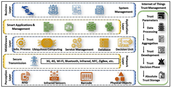 Internet of Things (IoT) [] consists of diverse standards of nodes in a heterogeneous environment connected with the Internet to communicate and exchange information in the network []. The classification of these nodes can be created based on their processing power wherein edge devices, such as sensors, contain the least processing power causing vulnerabilities []. The generic architecture of IoT consists of multiple layers, i.e., business, application, middleware, and perception layers [], which are illustrated in Figure 1. The business layer contains system management solutions that may be varied according to the requirements []. The middleware layer is the most critical layer that consists of information processing [], ubiquitous computing [], services management [], databases [], and decision units []. The network layer consists of transmission networks that provide a source by which IoT participating nodes can transmit information among them []. These transmission connections will be 4G, 5G, etc. []. The perception layer consists of edge nodes that can be RFID [], sensors [], or any physical object []. In [], a generic IoT trust architecture is proposed that integrates trust into all these layers as an integral component to manage security. IoT faces several security challenges [], e.g., authentication [,], access control [], trust management in cross-domain along with smart edge nodes [], security management in IoT equipped with VANET nodes, policy enforcement, secure middleware, and confidentiality.