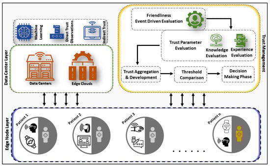 The identification of malicious and compromised is one of the important challenges in Healthcare 4.0 that can affect the network security and privacy of users. In this article, we have proposed EdgeTrust to address the challenges caused by these malicious nodes. The architecture of the proposed approach consists of three major layers which are data center/edge clouds, trust management, and edge nodes as illustrated in Figure 2. The data center contains the data center and edge cloud that have the capability of Naive Bayes [,] for the identification and classification and behavior prediction of malicious and compromised nodes by utilizing the stored direct observation collected by the network nodes. These observations are utilized further to formulate direct trust for edge nodes. Indirect trust at the data center layer can be formulated with the help of recommendations collected by the edge nodes. The trust management evaluation is a combination of events and time-driven under a different scenario. The direct trust degree is evaluated-based on the knowledge and experience component, which also involves the trust aggregation, threshold comparison, and decision-making phase. The edge nodes in IoT can be classified concerning their computational power and internal capabilities.