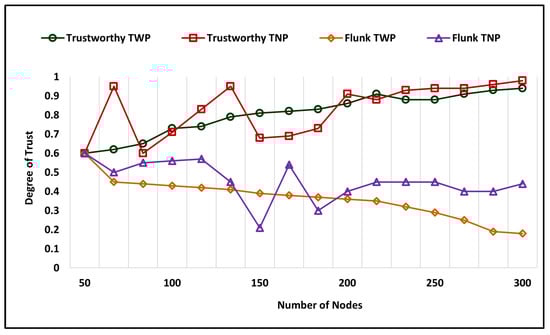 Trust aggregation is a process in which certain nodes evaluate the trust degree by using the previous trust and current trust to formulate an absolute trust degree for decision-making. In the proposed mechanism, nodes rank the performance of a particular node after obtaining the services, known as experience, and use that for aggregation purposes in future trust evaluation. We evaluated the impact of experience trust aggregation under two different scenarios in which trust computation is performed by nodes with or without experience aggregation, as illustrated in Figure 3. The figure shows the comparative analysis of trustworthy TWP (Trust with Previous) and trustworthy TNP (Trust with no Previous) observations. The trust evaluation of the trustworthy node with aggregation formulates a stable result and enhances accuracy, while the trust without aggregation illustrates a wavered trust degree over a time interval (t). In the second scenario, we performed an identical evaluation on the trust degree of malicious or compromised nodes, and the result showed similar outcomes in which Flunk TWP (Trust with Previous) represented a uniform trust degree and Flunk TNO (Trust with no Previous) showed notable inconstancy in the trust degree and also assigned a higher trust degree, highlighting the significance of employing previous experience in the proposed approach.