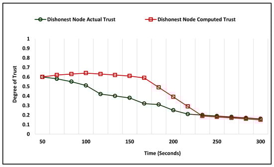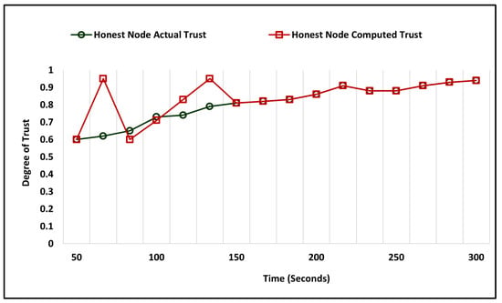 The accuracy of the honest and dishonest trust evaluation is determined by comparing the outcomes of the actual and computed trust degree by the model after the training phase. The simulation was performed to evaluate the trust degree of honest and dishonest nodes, with the comparative analysis illustrated by Figure 4 and Figure 5. The simulation time for the honest and dishonest accuracy evaluation was 300 seconds, with the minimum trust being 0.0 and the maximum trust being 1. The comparative analysis of the computed and actual trust degree of honesty is represented by Figure 4, which shows that the model took 147 seconds to evaluate the actual trust. During the evaluation of the dishonest trust degree, it took 162.5 seconds to remove the difference between computed and actual trust for accurate computations, as illustrated in Figure 5.