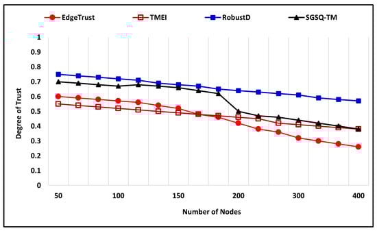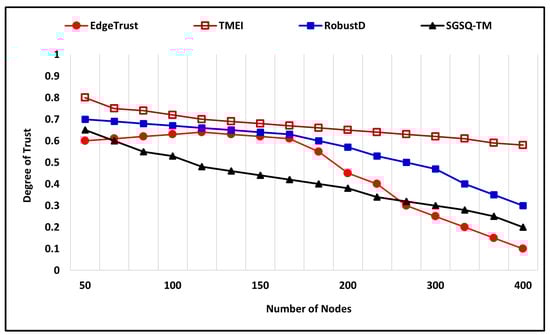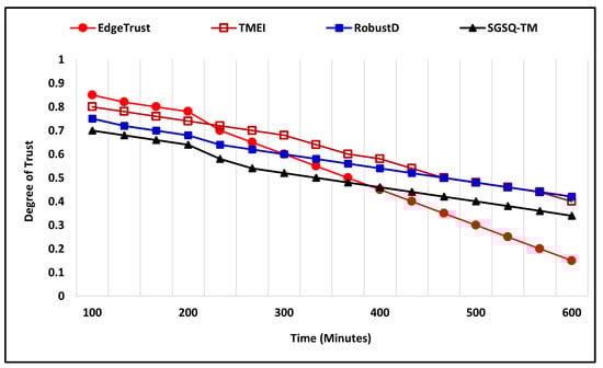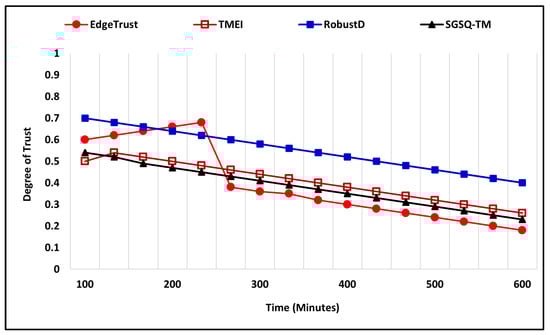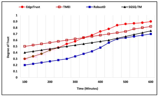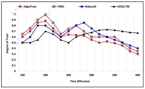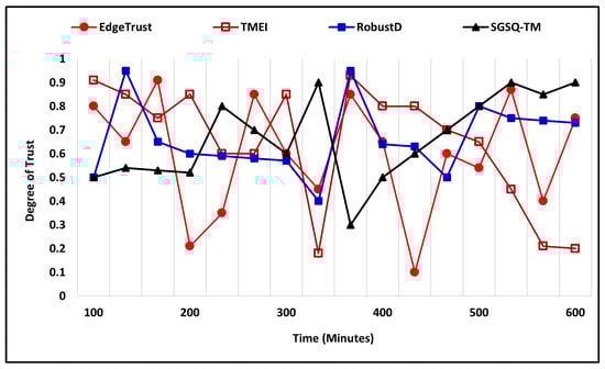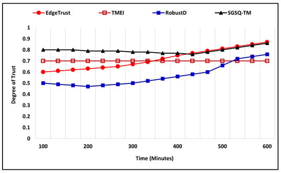 The bad-mouthing attack is also evaluated under two different scenarios by applying variation to the number of total nodes along with the percentage ratio of malicious and compromised nodes. In the first scenario of a bad-mouthing attack, the number of nodes is 400, where the percentage ratio of malicious nodes is 35%, and the simulation time is 600 (m). Figure 12 shows the simulation outcome in which malicious nodes try bad-mouthing trustworthy nodes by assigning a low trust degree while the increasing trust graph of the proposed approach clearly shows that it successfully recognizes the attack and assigns a higher trust degree to the nodes. The proposed EdgeTrust approach initially assigns a lower degree of trust, i.e., 0.3, but later it reaches 0.9, which is the highest trust degree. Furthermore, the existing approaches also show a notable performance against the attack and assign a higher trust degree to the trustworthy nodes. In the second scenario, the total number of nodes is 400, where the malicious and compromised nodes that execute the attack are 45%, and the simulation time is 600 (m). Figure 13 illustrates the comparative performance analysis of the proposed mechanism along with existing approaches. The EdgeTrust approach begins by assigning a default trust degree that increases with time and reaches 0.9, which is the highest trust degree. In comparison, the SGSQ-TM approach also manifests an effective performance and keeps the trust degree of trustworthiness higher, which is 0.4 in the beginning and reaches 0.7. The performance of TMEI is stable and assigns a higher trust degree, whereas the performance of RobustD assigns a lower trust degree, i.e., 0.2, but begins by assigning a higher trust degree after 450 (m) that reaches 0.5.