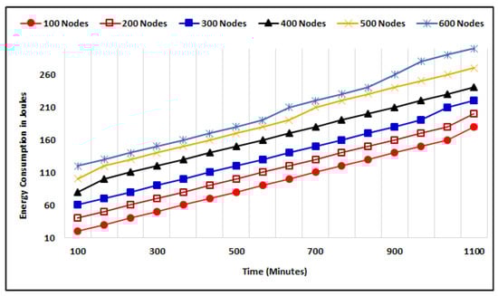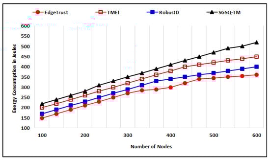 Communication and computation consume a notable amount of energy in IoT, and it is important to propose such approaches that consume less energy to make the implementation of green IoT possible in a real-world scenario. We have evaluated the energy consumption of proposed approaches with existing approaches by applying the variation to the total number of nodes, and the energy consumption is measured in Joules (J). We evaluated the energy consumption of the proposed mechanism with a fixed number of nodes by applying variations to the total time (t). Figure 14 illustrates the simulation which has been performed with 100, 200, up to 600 nodes, where the maximum energy consumed by the proposed approach at 1100 (m) is 240 (J) with 400 nodes, 270 (J) with 500 nodes, and 300 (J) with 600 nodes. The average energy consumption has also been evaluated with varying total numbers of nodes where the simulation time is 1100 (m). Figure 15 illustrates the energy consumption of the approaches that show that the proposed approach has utilized less energy to perform trust computation, whereas, in comparison, RobustD and TMEI use average consumption while SGSQ-TM approaches use a higher amount of energy to perform their computations. The maximum energy consumption of approaches with 600 nodes at 1100 (m) is 360 (J) of EdgeTrust, 450 (J) of TMEI, 400 (J) of RobustD, and 520 (J) of SGSQ-TM. The simulation outcomes of average consumption make the proposed approaches a better way to maintain security among IoT nodes.