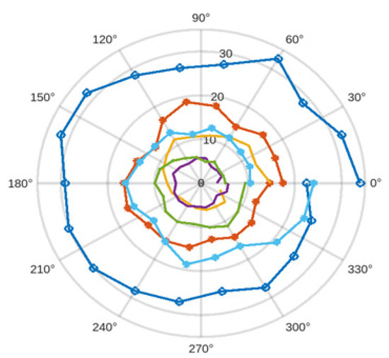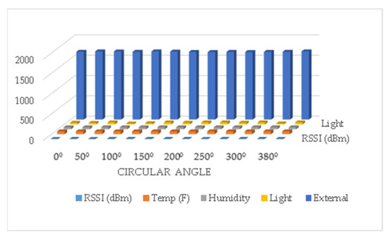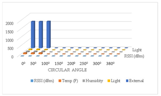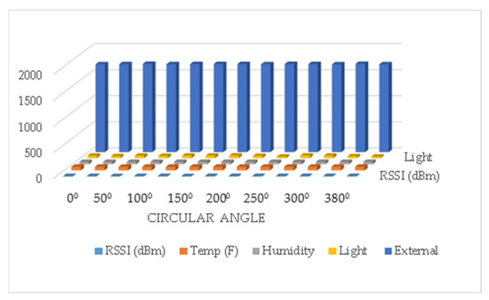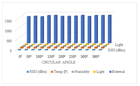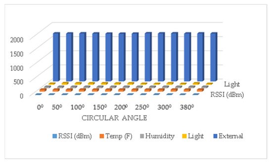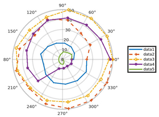 Figure 16 is based on the RSSI, which is obtained during the circular tour of the charger in constant motion. In this experiment, the sensor devices with patch antennas are fixed (note that the patch antenna has a 122° beam pattern), and the charger is mobile (Figure 3). When the charger changes the direction angle, then the sensor device degrades charging, and when the charger angle and sensor device angle are in the line of sight then the sensor device scavenges more energy. For example, in Figure 16, data1 and data5 are not in the line of sight, while data2, data3, and data4 are in the line of sight. At data3, the sensor device scavenges 100% of the energy from the charger. For this purpose, we can say that Figure 5 is the solution for the optimal placement of the sensor device.