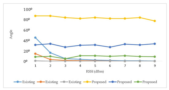 Figure 13 presents the comparison with the work of [26] based on RSSI from different angles and distances. He used fixed points for sensor devices and fixed the charger up the ground, but it creates the nearest-farthest problem. It is clear that our work is better. In the figure, existing represents the work of [26], while proposed is our work.