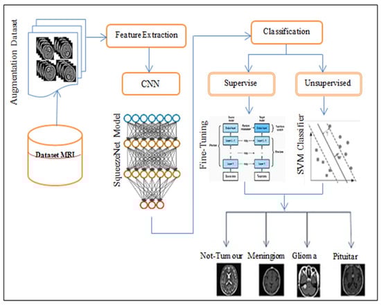 CNN’s SqueezeNet model is used in the hybrid deep learning algorithm based on two classification methods. Firstly, it uses both SqueezeNet and the unsupervised SVM classifier (SN-SVM). Secondly, it combines the supervised classifier and automatic feature extraction of SqueezeNet with Fine-Tuning techniques (SN-FT), as illustrated in Figure 1. This hybrid deep learning algorithm classifies MRI of human brain images as normal (not-tumour) or abnormal (tumour) tissue, and tumour types as meningioma, pituitary, or glioma.