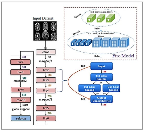 A fire module comprises a convolution layer with “squeeze” and “expand” layers. An input image is first passed through a standalone convolutional layer called “conv1”. A squeeze convolutional layer has a single filter. These are fed into an expanded layer, which contains of a mixture of 1 × 1 and 3 × 3 convolution filters that capture spatial information (feature extraction) at various scales, as illustrated in Figure 2. This layer is followed by eight “fire modules,” numbered “fire2” through “fire9”. After layers conv1, fire4, fire8, and conv10, max-pooling is performed with a stride of 2. The ReLU activation connects all the squeezes and expands the layers within the fire module. Dropout layers are added after the Fire9 module to reduce overfitting. Downsampling is placed relatively late, resulting in SqueezeNet with a “complex bypass” [20,21,22]. Figure 2 illustrates a zoomed-out image of the SqueezeNet architecture.