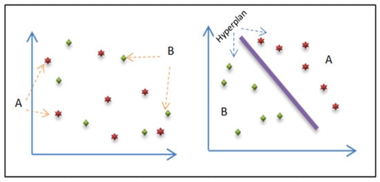 SVM is a commonly used classifier technique that is related to supervised learning methods and is applied in many fields, such as face analysis, medical image analysis, handwriting analysis, etc. It is especially useful for pattern detection and regression-based applications [24,25]. The SVM classification function solves the learning problem by separating the different sets and finding an “optimal” hyperplane.