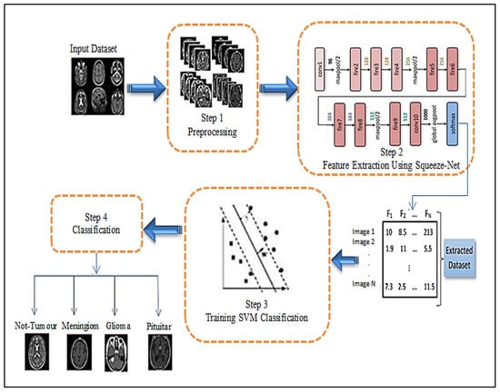 This proposed method uses an SVM classifier to identify normal and abnormal tissue in MRI brain scans (tumour, not-tumour, glioma, meningioma, or pituitary tumours). After features have been extracted from brain MRI scans using the SqueezeNet model’s convolution layers, the SVM algorithm will be applied to the FCL to categorise tumours. Figure 4 illustrates the structure of the hybrid classification model (SN-SVM).