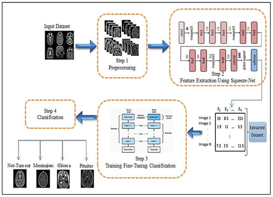 The SqueezeNet model and the combined Fine-Tuning technique (SN-FT) of outputs are utilised by this approach. After feature extraction, SqueezeNet was used to extract features and classify brain tissue though MRI images using Fine-Tuning techniques to determine abnormal output tissue (glioma, meningioma, pituitary tumours, or not-tumour). Fine-tuning is a process that takes an already-trained (pre-trained) model, such as the SqueezeNet model, which is used for feature extraction though MRI of human brain images, and retunes or tweaks the model to make it perform a second similar mission by freezing the weights of the first few layers of the network. A new output layer (soft-max) is then added to the target model, with the number of outputs equal to the number of categories in the target dataset. Finally, the SqueezeNet model is ready to retrain the new dataset by setting the initial layers to zero. The layers’ significant freezing process increases the network’s training speed. Figure 5 illustrates how CNN-based hybrid deep learning with output fine-tuning is assembled and Figure 6 shows the structure of fine-tuning technique process.