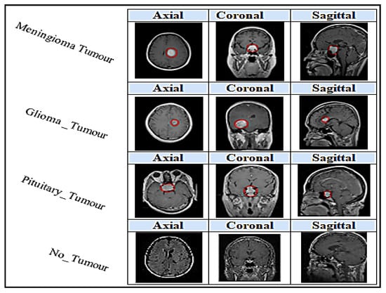This study applied data augmentation methods to a large dataset consisting of 3460 unique brain MRI image types [31]. In 2017, Jun Cheng was the first to publish the dataset online; in 2020, Sartaj Bhuvaji updated the most recent revision [32]. There are 3064 images of T1-weighted, contrast-enhanced MRI images in the image dataset sourced from kaggle.com. Meningiomas account for 708, gliomas for 1426, and pituitary tumours for 930; these are the three most common types of brain tumours. From 233 patients, images were obtained in three different orientations: axial (994 images), sagittal (1025 images), and coronal (1045 images). The data were randomly divided into training and testing sets, with 80% of the data allocated to the former and 20% to the latter. There are four additional folders inside each main one. These files contain MRI scans of the various tumour types [32]. Figure 7 shows meningioma, pituitary, glioma, and not-tumour used in this dataset and displays each tumour type’s axial, sagittal, and coronal planes.