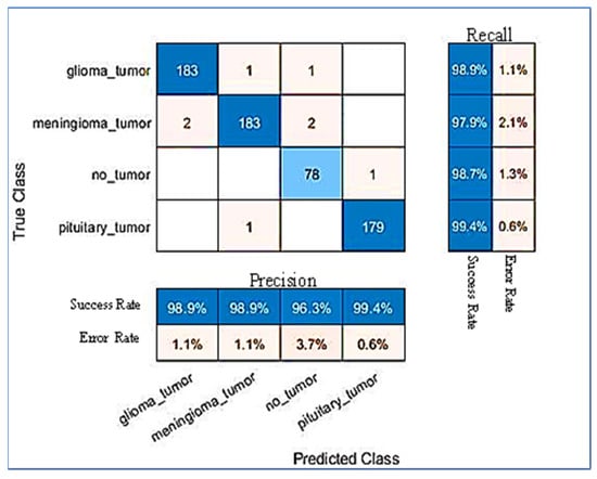 All experiments were conducted on a laptop with a hard SSD-type drive, 20 GB of RAM, and an Intel Core-I7 processor. The MRI brain image dataset was of size 224. The dataset was separated into training and testing sets, with 80% of the data in the former and 20% in the latter, respectively. The following sections detail the outcomes of applying the proposed classification dataset to brain images using the specified CNN architecture (hybrid deep learning) based on two combined methodologies, with the first combining the SqueezeNet technique with the SVM technique (SN-SVM) and the second combining the SqueezeNet technique with the Fine-Tuning technique (SN-FT), to identify tumour type through MRI brain images. The overall confusion matrices are depicted in Figure 8 and Figure 9, with the conclusion that the proposed system was able to classify brain tumours with 98.7% accuracy when using the SN-SVM method and 96.5% accuracy when using the SN-FT method, with both having an input picture size of 224 by 224 pixels.