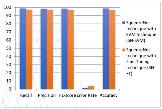 Figure 11 illustrates that the SN-SVM method proposed classifier had the best performance, with 98.7% accuracy, 98.7% recall, 98.3% precision, 98.5% specificity, and 1.3% error rate.